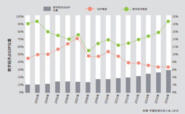 全球知名信息技术咨询公司IDC在网易云创大会上发布了《2018中国企业数字化发展报告》。报告显示,近几年数字经济占GDP比重逐年增加,至2017年已经达到32.9%,规模达27.2万亿元。但相对于发达国家(美、德、英)数字经济占GDP比重超过50%,仍有很大提升空间。目前我国数字经济增速将近20%,已超过上述发达国家。