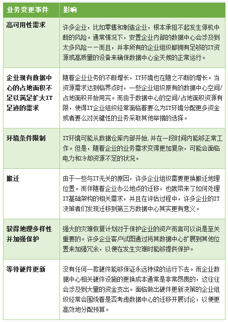 有一些推动企业数据中心实施迁移的催化剂。一些企业可能有着预算方面的决策,以便响应对于企业内部数据中心运营的电力和冷却成本的节约。其他一些企业则可能不再具备继续在企业内部运营数据中心业务所需的足够的数据中心占地面积。在以下的表格中,我们将为广大读者朋友们分析导致当前的企业组织需要考虑实施数据中心迁移的相关业务变更事件。