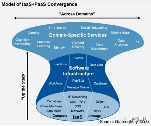 2018年5月,Gartner展示了一幅IaaS与PaaS融合的模型,从纵向和横向两个维度阐述了未来云计算的发展。从横向也就是业务发展的维度看,越来越多不同的业务领域,比如电商、游戏、社交网络、物联网、移动应用、机器学习等,都构建在云平台之上;从纵向的架构支撑的维度看,中间的PaaS层成为一个“瓶颈”或者说是需要突破的重点,因为用户对PaaS层的需求越来越高,除了通用的管理类的内容,比如租户管理、运维管理、安全等都是强需求以外,像微服务、大数据、AI这样的新内容也都通通归到了PaaS层。另外,PaaS还要肩负起管理大量开源组件的重任。依据上述特征和需求,Gartner给了PaaS一个新的名字——Software Infrastruture(软件基础架构)。