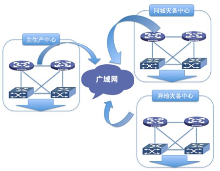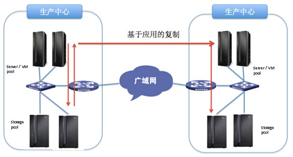 应用级灾备要求提供冗余的网络线路和设备。正常情况下,客户端通过生产中心的业务网络访问生产中心的应用服务器;在发生灾难时,通过网络切换,客户端能够访问到灾备中心的备用服务器。